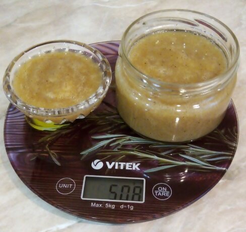 Когда новое блюдо вызывает только положительные эмоции и наслаждение, внутренний голос предупреждает о вероятных лишних килограммах. Но перед этим чудо-джемом устоять невозможно! Лучше ограничу себя в чем-то другом. Простой рецепт, а в результате - восторг и блаженство. Кстати, цифры на весах показывают брутто (вес с тарой). Нетто назову в конце статьи. В стеклянную чашу для микроволновки кладу 3 столовые ложки сахара, 2 столовые ложки меда и щепотку лимонной кислоты. Наливаю 130 мл воды. Ставлю чашу на огонь и, помешивая, довожу смесь до кипения. У меня уже очищены и нарезаны 2 любимых банана. Их и отправляю в закипевшую сладкую воду. Помешивая изредка, буду варить бананы. Появившуюся пену по возможности убираю, но не до фанатизма. Через 8 минут выключаю огонь. А в чашу высыпаю заранее подготовленные корицу (1/4 чайной ложки) и ванильный сахар (1 чайную ложку). Все перемешиваю и снимаю чашу с печки. Погружным блендером перетираю все в однородную массу. Чудо-джем готов. И получилось ег