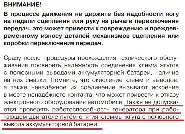 Даже люди, которые принципиально не хотя заниматься ремонтом машины (такие, как я))), иногда вынуждены это делать. Хотя бы по мелочам. У меня, например, ещё на Приоре затроил движок. Заехал в первый попавшийся сервис. Рассказал о беде. Мне ответили - скорее всего катушка. Ёпрст… Я и так знаю, что скорее всего катушка. Поменяйте, говорю. Нет, отвечают, не можем. У нас автоэлектрик на больничном. Ну как так то? Приходишь к людям, говоришь - возьмите у меня деньги, пожалуйста. А они не берут! Доехал до магазина, купил катушку. Поменял. Пять минут работы! Открыть капот и отвернуть один болтик. Так что приходится иногда и самому что-то делать, хотя и не хочется. А поскольку я до сих пор почитываю инструкцию на Весту, то выковыриваю оттуда любопытные сведения. Например, там написано, как не надо проверять генератор: То есть при работающем двигателе нельзя отсоединять клемму от аккумулятора. Потому что во всех современных машинах куча электроники, которая может при этом накрыться медным тазом