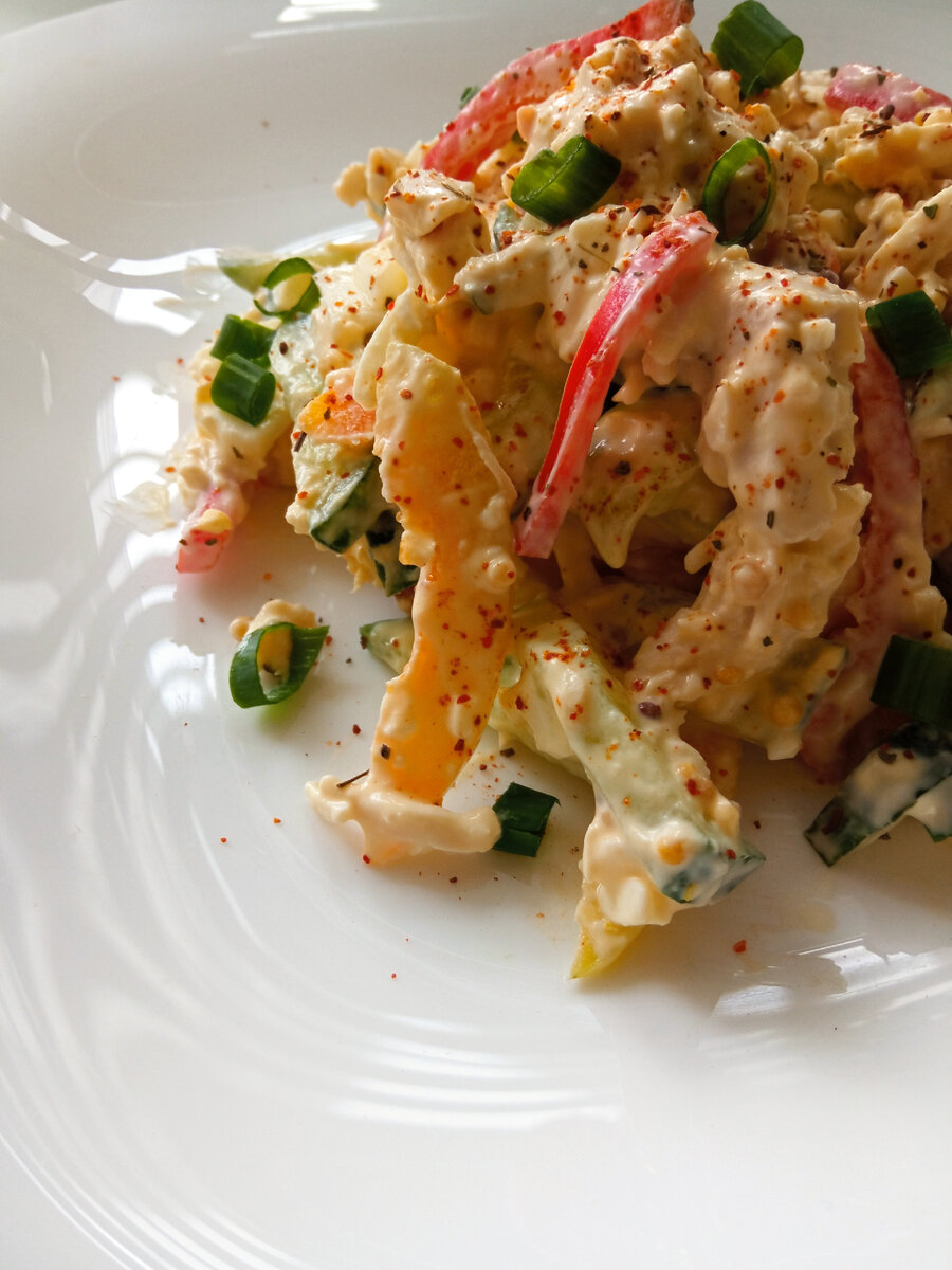 Всем большой привет! Нравятся быстрые, простые, вкусные салаты? Тогда вы нашли его.... сытный,не жирный, гармоничное сочетание ингредиентов, хорошо знакома с этим рецептов, так как часто готовлю на скорую руку. Ниже подробно описываю рецепт, каждый шаг фиксируя, мне будет приятно, если вы поставите пальчик вверх и поделитесь своим мнением о рецепте. Вкусный, хрустящий... РЕЦЕПТ: Свежий огурец - 2 шт. Отварное куриное филе - 1 шт. Болгарский перец - 1 шт. Отварные яйца - 2 - 3 шт. Соль, перец по вкусу Сметана - 2 ст.л. Горчица - 1 ст.л. Зелень по желанию ПРИГОТОВЛЕНИЕ: Свежий огурец 2 шт. нарезаю соломкой Болгарский перец 1 шт. (я взяла половину желтого и красного) нарезаю соломкой Отварное куриное филе нарезаю на кусочки Отварные яйца 2 шт. (категория С0) нарезаю кубиками По желанию можно взбить яйца, обжарить на сковороде блинчиком и нарезать соломкой Все ингредиенты выкладываю в чашу Добавляю сметану 2 ст.л. (майонез, йогурт, мягкий творог) Добавляю дижонскую горчицу 1 ст.л. (можн