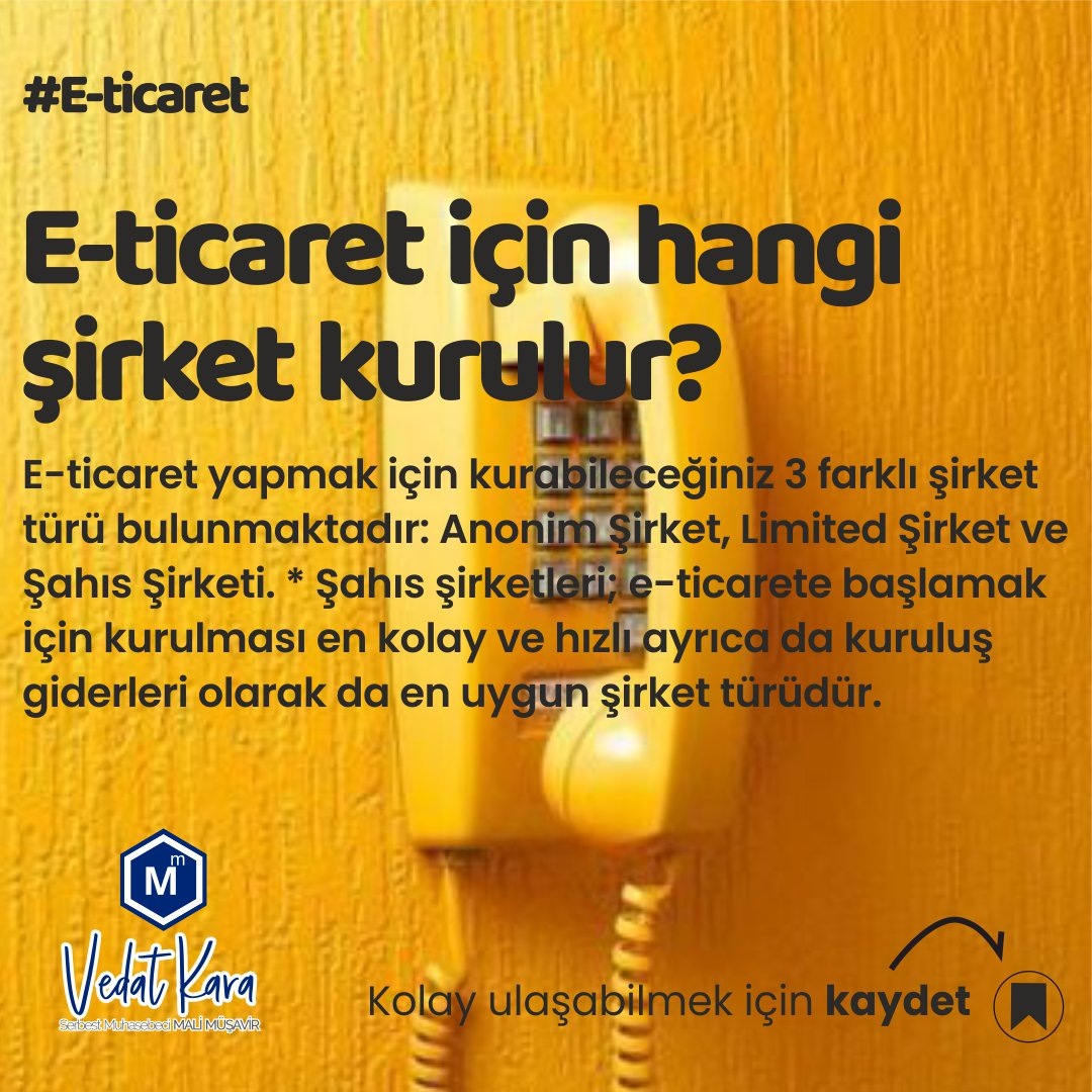 E-ticaret için hangi şirket kurulur? E-ticaret yapmak için kurabileceğiniz 3 farklı şirket türü bulunmaktadır: Anonim Şirket, Limited Şirket ve Şahıs Şirketi. * Şahıs şirketleri; e-ticarete başlamak için kurulması en kolay ve hızlı ayrıca da kuruluş giderleri olarak da en uygun şirket türüdür. Ankara /Yenimahalle www.vedatkara.com Ankara Mali Müşavir #malimusavir #muhasebe #muhasebeci #kosgeb #limitedşirket #girişimcilik #işkur #anonimsirket #şahısşirketi