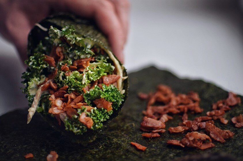 Так что по крайней мере я на это рассчитываю ... Я полюбил водоросли Нори с тех пор, как впервые попробовал суши. Однако суши не так много, и, кроме того, приготовление суши без шелка в домашних условиях - не совсем мое любимое занятие. И мне пришло в голову сделать дома хотя бы «чипсы» из нори. Когда вы кладете на сковороду немного масла из водорослей нори, а затем хрустите его перед телевизором, как чипсы. Однако, как и в случае со мной, я уже ел чипсы из нори, но у меня все еще есть хороший запас водорослей нори в моем шкафу. Оказалось, что я начал укладывать в них все, что мог. Лучше всего было соединить водоросли нори с салатом цезарь из завитка, который настолько совершенен, что даже можно подумать, что водоросли нори начали расти именно так, чтобы их можно было есть одновременно с этим салатом. Ингредиенты