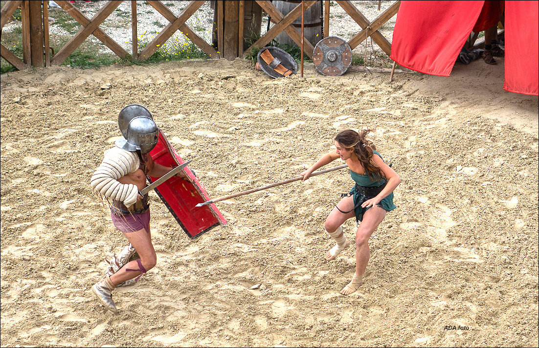 В воскресенье посетил его второй раз и снова наделал много снимков. Помните, я в прошлой статье писал, что опоздал к боям гладиаторов? На это раз пришёл в римский лагерь Каструм вовремя. Но наибольшее впечатление произвёл бой той самой суровой девицы с опытным бойцом. Оказалось, что это купленная владельцем школы гладиаторов "дикарка" в понимании римлян. Так выглядело сражение, как всегда, желательно кликать по снимку мышкой: Сначала она всячески старалась поразить противника копьём Кстати, вон тот самый ланиста с микрофоном комментирует бой. В какой-то момент ей даже удалось выбить меч из рук соперника: А когда в свою очередь лишилась своего оружия, применила древний приём, укусила руку врага: Но мастерство всё же решает исход боя Дикарка была повержена, но публика потребовала сохранить ей жизнь. Зрители боя: Потом я вновь наведался к генуэзцам. Посмотрел работу кузнеца: Когда он отвлёкся, к наковальне подобралась одна из жительниц усадьбы: Почему-то это устройство вызывало особый
