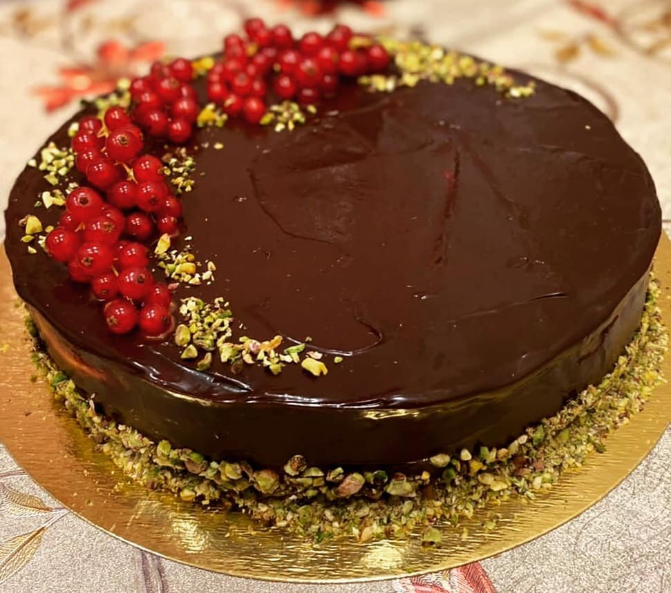 У остывшего коржа я срезала верхушку, т.к. она "горбатая" получилась (я её потом в другой десерт использую). Собираем в кольце, прокладываем ацетатной плёнкой. Корж кладём вниз, пропитываем молоком, выкладываем крем, и оставляем в холодильнике на 4-5 часов. Затем достаём, убираем плёнку и покрываем глазурью. Украшаем на свой вкус. У меня украшен фисташками и красной смородиной
