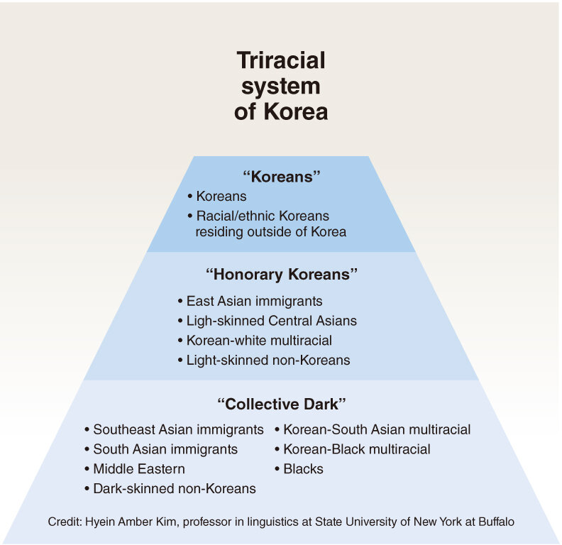 Первоначально «расовый порядок» заключался в том, чтобы отличать корейцев от некорейцев, но с волной рабочих-мигрантов с 1990-х годов иерархия превратилась в трехуровневую систему, говорит Ким.