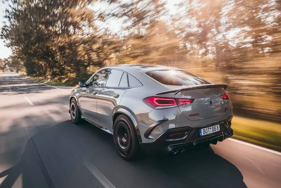 Brabus 900 Rocket Edition из кроссовера Mercedes-Benz GLE Coupe создан по тому же рецепту, что и одноимённый внедорожник на базе «Гелика». Мотористы из Боттропа увеличили рабочий объём двигателя M 177 на 425 кубических сантиметров, заменили турбонагнетатели, поршни, шатуны, коленвал, загрузили новую прошивку и установили выхлопную систему из нержавейки. Итог — 900 лошадиных сил и 1250 Нм крутящего момента, но тяга ограничена электроникой на отметке 1050 Нм, чтобы достигнуть нужной надёжности. Из других улучшений — фирменный аэродинамический обвес Brabus с компонентами из углепластика, иная калибровка пневмоподвески Airmatic (по умолчанию клиренс уменьшен на 2,5 саниметра), нестандартные углерод-керамические тормоза с перфорацией, а также кастомные диски BRABUS Monoblock диаметром 23 или 24 дюйма. 2 / 9 Салон первого кроссовера Brabus 900 Rocket Edition украшен вишнёвым хромом и алюминием, серой кожей, алькантарой и углеродным волокном, но клиенты могут выбрать для себя не столь эпат