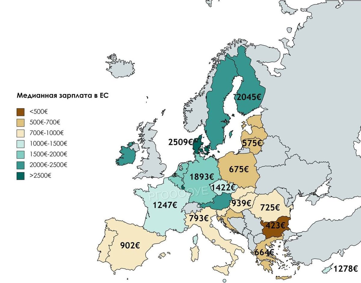 Медианная зарплата в Евросоюзе 🇪🇺 Медианная зарплата выражает значение, согласно которому 50% населения получают доход выше данного, а другие 50% — ниже 🍒 Медианная зарплата является более точной оценкой материального благосостояния среднестатистического жителя по сравнению со средней зарплатой 🤓 Наибольшее значение наблюдается в Люксембурге (3356€), наименьшее — в Болгарии (423€) 🗿