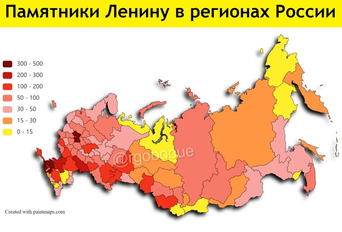 Число памятников Ленину в российских регионах ☄️ Абсолютным лидером оказался Краснодарский край с его обилием бывших колхозов и совхозов (496 монументов). Рядом с ним расположились Московская, Ростовская и Саратовская области, в каждой из которых таких памятников более двухсот ⭐️ Примечательно, что в Ингушетии всего один памятник Ильичу 🍎