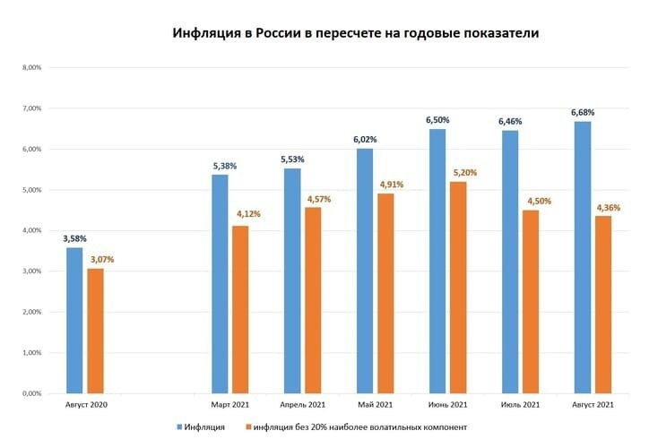 Опубликованные Центробанком данные свидетельствуют о постепенном росте инфляции в 2021 г. с 5,38% в марте до 6,68% в августе.