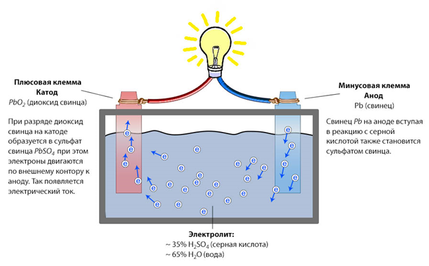 - Принцип действий аккумулятора основана на образовании разности потенциалов между двумя электродами, погруженные в электролит.