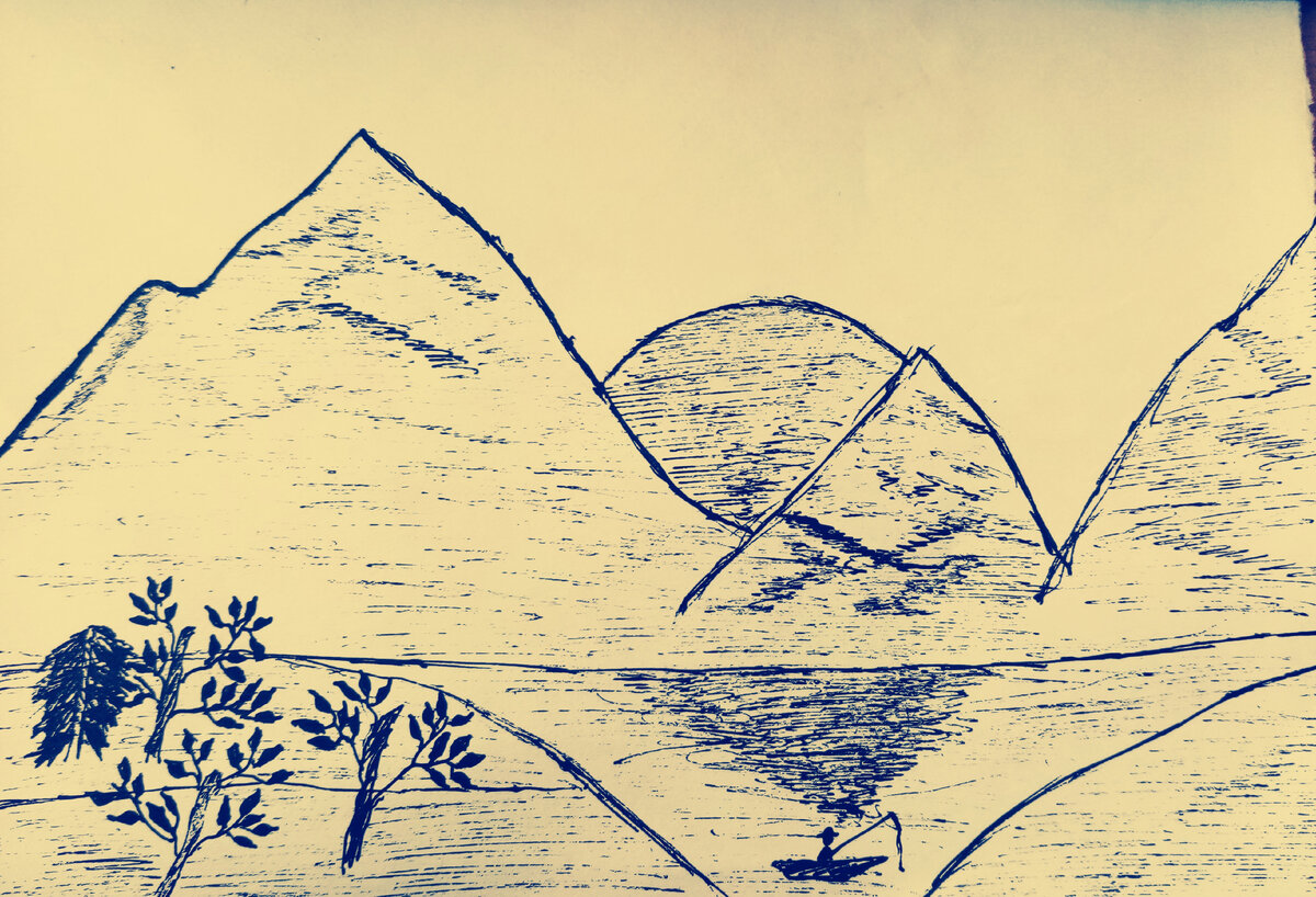 Рисунки моего детства... Научиться рисовать такие рисунки это легко даже человек, который этого не умеет может начать с чего-то как пейзаж и у него получиться все. Ведь все великие художники писали на холст пейзаж. И в детстве на уроке рисование на свободной теме рисовал пейзаж. В этом рисунке имеется простая геливая ручка, когда вы рисуете ручкой оно всегда получается легко и вдохновляюще. Во время рисования ручкой нельзя допускать ошибки и это даёт вам навык не ошибаться. Вы спросите почему же я нарисовал горы я вам скажу это одно из чудо света, я всегда восхищался ими. Они прекрасны по своему каждый из них. Каждый снег в их вершинах, каждое дерево внизу, которая цветёт уже много лет. Человек в лодке - я бы описал его как в горной тишене обретяется покой души у людей. Эти прекрасные солнечные лучи, которые отрожают их и мерцают в воде. И в заключение хочу сказать что этот рисунок должен описываться дальше, ведь горные пейзажи они всегда не заканчиваются.