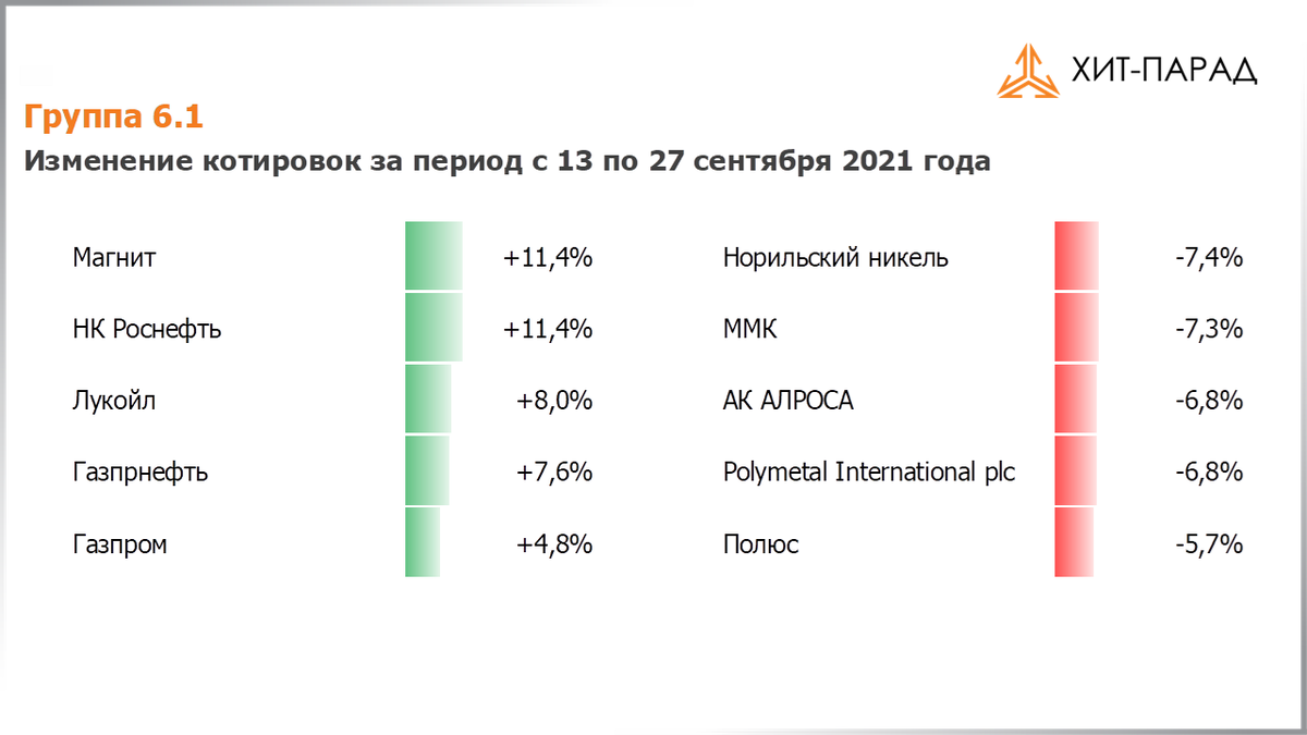 Здравствуйте, уважаемые зрители! С Вами в студии – Артем Абалов. Вашему вниманию предлагается традиционный обзор торгов на российском рынке акций за период с 13 по 24 сентября текущего года. В отчетном периоде индекс Московской биржи увеличился на 0,9%, составив 4 038 пунктов. При этом активность операторов рынка находилась на среднем уровне. Посмотрим, кто стал лидерами роста и снижения в разрезе традиционных групп акций. В группе 6,1 лидером роста стали акции Роснефти, прибавившие в цене свыше 11%. Инвесторов воодушевили планы о возможном получении компанией права экспорта газа в Европу, а также продажа доли в проекте Восток-Ойл. Сопоставимый рост показали акции Магнита на фоне отсутствия значимых корпоративных новостей. Высокие цены на нефть и газ обусловили внушительный рост курсовой стоимости других нефтегазовых акций: в пятерке лидеров находятся акции Газпрома, Лукойла и Газпром нефти. Пятерку аутсайдеров составили бумаги представителей горно-металлургического комплекса. На фоне