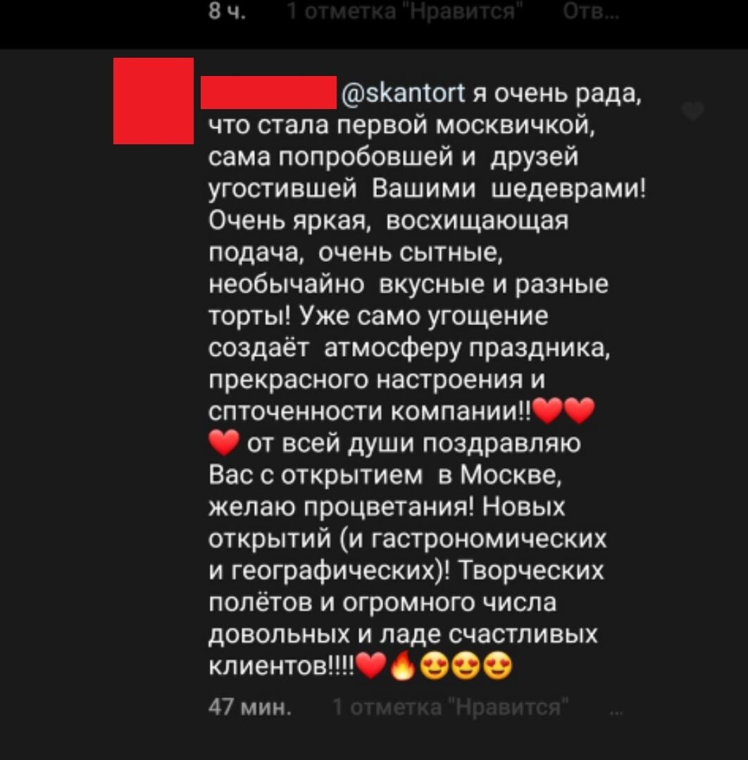 Друзья, недавно мы выполнили свой первый заказ в Москве. Случай поистине уникальный! Во первых День Рождения заказчика. Во вторых - это уже наш клиент, в Санкт-Петербурге уже оформлял заказ для родителей и все остались очень довольны. В третьих ответственность - ПЕРВАЯ доставка в Москве. Заказ был аж на 6 тортиков. Один мы конечно же подарили в честь праздника и добавили 5 морсов. Мы очень волновались, региональный менеджер поехал на производство в понедельник и до темноты завершал вместе с поварами последние штрихи. Поправлял мелкие недочеты которые на первых порах имели место быть. Но всё получилось, тортики вышли идеальными! Часто бывает, что первый блин выходит комом, но не в нашем случае! У нас всё получилось, мы выполнили заказ и доставили его вовремя! А отклик не заставил себя долго ждать. С разрешения заказчика публикуем отзыв. Таких теплых и светлых слов мы очень очень давно не читали. 😊😊😊 P.S. заказ был в Инстаграме! Кстати, кто еще не подписан, будем рады! Если тут мы в