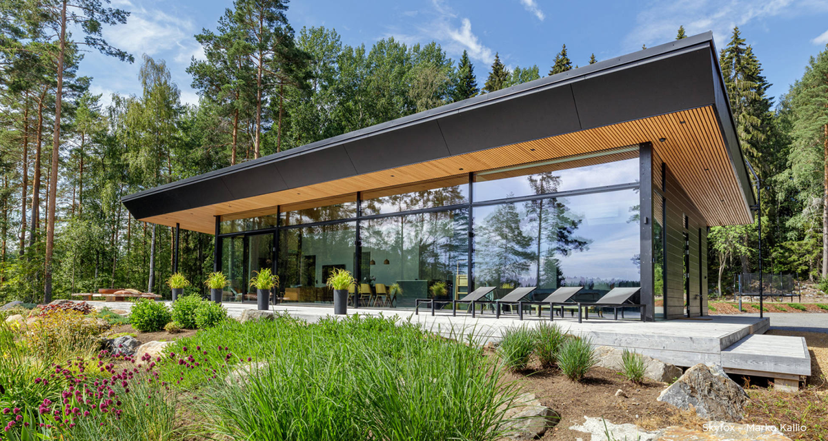 Финляндия — страна озер и хвойных лесов. Неудивительно, что 90% дачных домов там расположены на берегу водоемов и даже имеют свой причал. Сами жилища нередко строятся из сосны. Правда, в большинстве своем они совсем не похожи на бабушкину избушку и выглядят современно и стильно. Яркий образец современного финского дома стоит в окружении высоких сосен на каменистом склоне, спускающемся к живописному озеру. Он отличается ясным и чистым дизайном, с большим количеством стекла и открытого пространства. Значительная часть конструкции дома построена с использованием бруса из финской ели. Древесина имеет свежий светлый оттенок, который со временем не темнеет, а также особую ячеистую структуру, обеспечивающую устойчивость к суровому климату и влажности. Прозрачный фасад, выходящий на озеро, — это безрамные окна HTWS — запатентованное решение, объединяющее фиксированные окна и деревянные несущие элементы в одну конструкцию. Деревянный каркас и алюминиевые рамы образуют очень прочный пакет, идеал