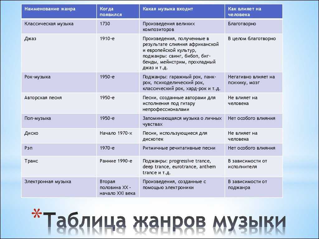 Сегодня мы узнаем самые популярные жанры музыки, год появления и влияние на человека. 1. Основные черты поп-музыки — простота инструментальной части, ритмичность, акцент на вокал. 2. Рок. в данном случае указывает на характерные для этих направлений ритмические ощущения, связанные с определённой формой движения. 3. Хип-хоп-музыка состоит из стилизованной ритмичной музыки, которая обычно сопровождается рэпом, ритмичной и рифмованной речью, которую произносят нараспев. 4. Рэп - мелодизированный речитатив, обычно на фоне однообразного остинато 5. Электронная музыка, созданная с использованием электромузыкальных инструментов и электронных технологий (с последних десятилетий XX века — компьютерных технологий). 6. Транс. Стиль получил такое название из-за повторяющихся музыкальных фраз, прогрессий, секвенций и остинато, которые могут погружать слушателя в состояние транса. 7. Диско - один из основных жанров танцевальной музыки XX века, возникший в начале 1970-x годов. 8. Авторская. Его