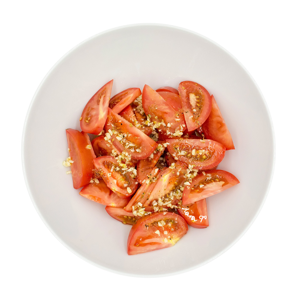 Очень достойный салатик! Будет хорош естественно из ароматных "своих" помидоров, но также, что является несомненным плюсом, заправка исправит и улучшит вкус зимних "магазинных" помидоров. Рекомендую попробовать. Ингредиенты: Помидоры порежьте дольками, сложите в салатник. Чеснок мелко порубите и в маленькой миске смешайте все ингредиенты заправки (чеснок, орегано, пажитник, соль, перец, уксус, мёд и масло). Полейте помидорки заправкой и дайте настояться хотя бы пол часа.