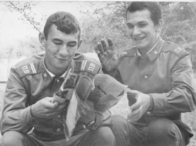 Снова запрыгнул в сапоги, вещмешок за плечо и прямиком вниз. Не мешало бы покушать, а то с обедом я "пролетел". Помню, напротив санчасти магазин "Военторга". Смотрю -открыт. Захожу. За прилавком скучающая продавщица, на вид лет так, сорок.-Здравствуйте! -Здрасьте! Простенький продовольственный ассортимент, в основном, все забито военным барахлом. Покупаю две пачки печенья и бутылку лимонада. Куда с этим идти? Где перекусить? Остется только курилка. Стоит полуденная жара, территория части пустая, словно все вымерли. А в курилке хорошо, там рядом растут развесистые деревья. Сажусь на скамью, срываю о край стола пробку с бутылки и раскрываю печенье. Быстро все употребил. Смотрю, из казармы выходит Малинка и с ним солдат и направляются к курилке. Солдат (это дневальный) начинает убирать территорию.