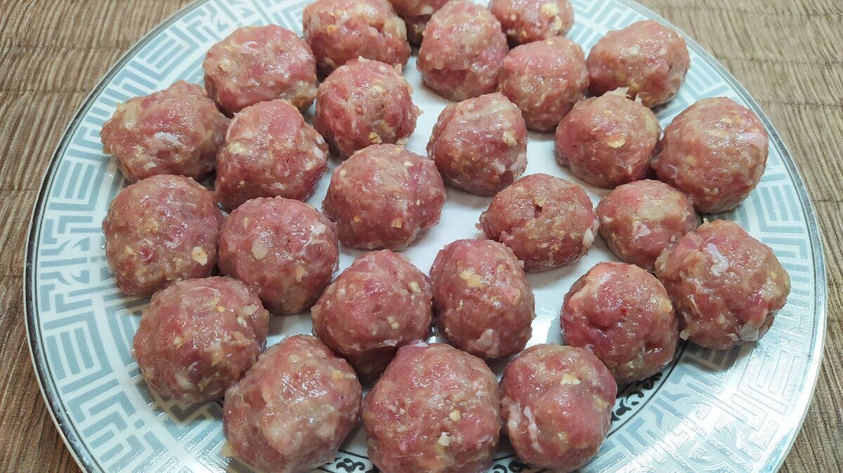 Фарш посолить поперчить, слепить фрикадельки. Овощи нарезать, обжарить 3 минуты лук с морковью на масле, добавить картофель, перец и фрикадельки, немного посолить, потушить 10 минут, добавляя по немногу воду. Далее добавить кабачок, томатную пасту, посолить, приправить, тушить под крышкой до готовности минут 10-15. Подавать с зеленью. Приятного аппетита!