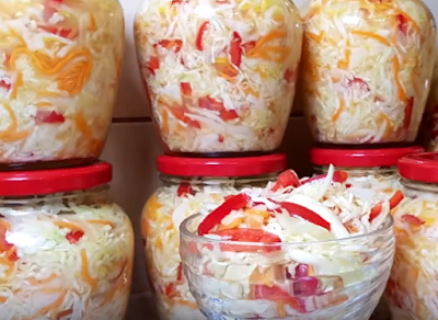 сахар - 1/2 стакан Капусту мелко шинкуем и выкладываем в эмалированный таз. Морковь чистим и трем на крупной стороне терки. Лук чистим и режем полукольцами. Болгарский перец чистим и режем. Все перемешиваем с капустой, добавляем соль и сахар. Добавляем масло и перемешиваем. Готовый салат раскладываем в банки и храним в холодильнике. Капуста содержит большое количество пищевых волокон, которые помогают «связывать» тяжелые металлы и токсины, а затем выводить их из кишечника. Кроме того, она богата органическими кислотами, которые улучшают пищеварение и нормализуют микрофлору органов пищеварения. Но и это еще не все. В капусте содержится очень редкий витамин U. Он «обезвреживает» опасные химические вещества, участв