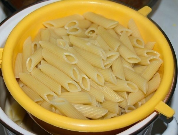 1. Макароны отварить до состояния «аль денте», чтобы они были твердоватыми, но не жесткими, после чего откинуть на дуршлаг.