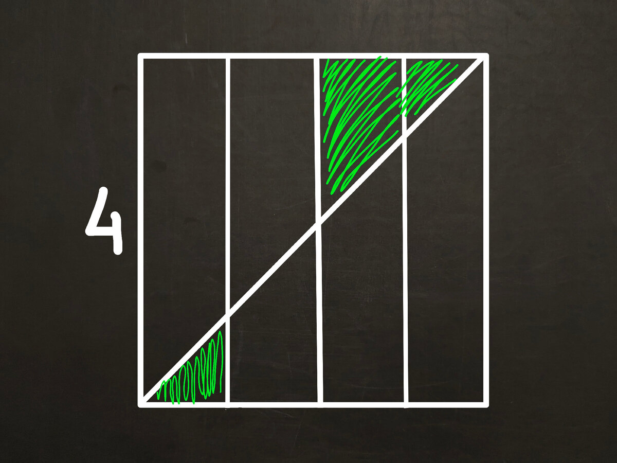 Я могу ошибаться, но, по-моему, эта задача пришла в российский интернет из Китая. Кажется, я встречал её на каком-то форуме и там говорилось, что её дают китайским второклассникам. У нас программа несколько другая, поэтому нашим второклассникам я такое давать не решился, но дал пятиклассникам (со всей предысторией про китайцев). А некоторые из них задали эту задачку своим родителям. Реакция одного из родителей была такой: "Это что правда решают во втором классе?". Да, решают. Правда, не у нас. Хотя в задаче нет ничего сложного. В оригинале нам просто дают вот такой рисунок и просят найти заштрихованную площадь. У детей, как показывает практика, вопросов по рисунку не возникает. Зато у взрослых их хоть отбавляй. Квадрат ли это? А на равные ли прямоугольники разделен квадрат? Поэтому давайте уточним: на рисунке изображен квадрат, в котором проведена диагональ и который разделен на четыре одинаковых вертикальных прямоугольника. Решать можно по-разному, но не забываем, что это всего лишь