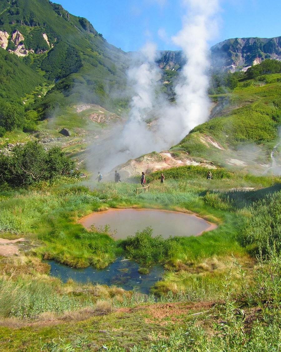 Россия 🇷🇺, Камчатка, Долина гейзеров Долина гейзеров — одно из крупнейших скоплений гейзеров в мире, красота её уникальна и поистине ошеломительна. А еще долина возглавляет список семи чудес России, уступая только Байкалу, и является частью объекта Всемирного наследия ЮНЕСКО «Вулканы Камчатки». Долина расположена в Кроноцком биосферном заповеднике, территория которого максимально охраняется в целях сберечь эту уникальную природную зону. Давным-давно здесь было озеро, исчезнувшее под влиянием вулканических процессов, а на его месте из-под земли стали вырываться фонтаны кипящей воды. Долина была открыта только в апреле 1941 года геологом Татьяной Устиновой и проводником Анисифором Крупениным. Всего в долине сотни маленьких и больших гейзеров и термальных вод. Гейзеры вообще явление редкое и, помимо Камчатки, вы можете увидеть их только в Америке, Исландии, Новой Зеландии и Чили.