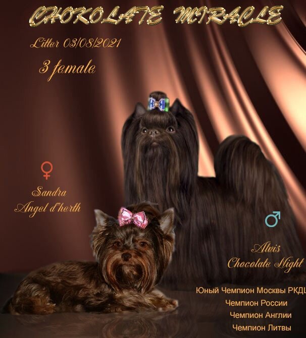 Щенок йоркширского терьера окраса ГОРЬКИЙ ШОКОЛАД!!! ищет самых любящих родителей. Свободна 1 девочка.Д.Р. 03.08.2021г.Предполагаемый вес 1,8-2 кг. Шерсть шелковая (не сваливается, не колтунится и не линяет). Носик короткий(беби-фейс). Приучена к пеленке. Прикус норма.Родничек зажил.Грыжи нет. Без недостатков. У мамы первый помет.В помете три щенка.Папа юный чемпион Москвы, чемпион России, чемпион Великобритании, Чемпион Литвы.На момент переезда будут все прививки по возрасту, чип, документы IHR(Германия). ВК https://vk.com/id180268828