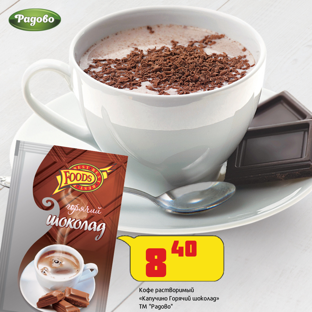☕ Кофе растворимый "Капучино горячий шоколад" от торговой марки Радово. 🍳Состав: Сахар-песок, заменитель сухих сливок на основе растительных жиров (кукурузный сироп, растительное масло, растительный белок, эмульгатор Е471, стабилизатор Е340, ингибитор комкования Е551), какао-порошок алкализованный, кофе натуральный растворимый порошкообразный, ароматизатор "Шоколад", ароматизатор "Ваниль." 👌 Заказать: 💻 На сайте https://radovo.su/ 📞 по телефону 8(3412)540-600 🚚 Доставка по Ижевску бесплатная при заказе от 1000 руб. По России отправляем курьерской службой боксберри.