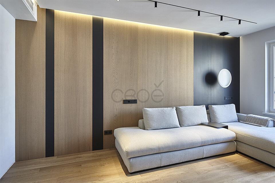 Для гостиной мы выполнили стеновые панели по эскизу дизайнера. Было решено скомбинировать два материала в контрастных оттенках, чтобы стена получилась визуально яркой и необычной, но в то же время гармонировала с паркетной доской и светлой мягкой мебелью.