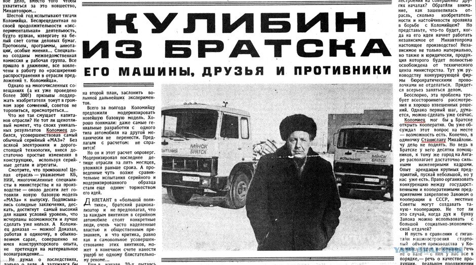 Вспомнилась публикация советских времён в газете «Известия», о простом шофёре из города Братск, Станиславе Коломиец, который работал на машине «МАЗ-500». Статья была довольно объёмная, где подробно рассказывали об изобретательских качествах простого работяги. Коломиец внёс много полезного в работу двигателя, благодаря этому машина стала экономичней на 12%, не в ущерб мощн