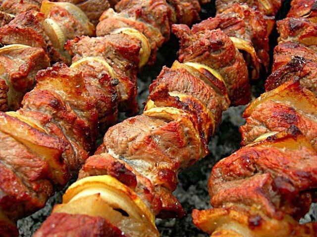 1 кг молодой баранины или корейки, 3-5 луковиц, соль, чёрный и красный молотый перец, сок лимона, чеснок. Корейку нарубить на кусочки примерно по 30 - 35 г, посолить, поперчить, положить в глиняную посуду, перемешать с тёртым репчатым луком, измельчённым чесноком, сбрызнуть соком лимона, поставить в холодное место на 6 - 8 часов. Затем нанизать кусочки мяса на шампуры и жарить на углях, в электрогриле или газовой духовке, помня, что пламя - враг шашлыков. Угли должны лишь "дышать жаром". К шашлыку обязательно подавать много зелени - кинзы, петрушки, базилика, эстрагона, зелёного лука, нарезанного кольцами маринованного репчатого лука, лимон, маслины или оливки, шашлычный соус, гранатовый сок, минеральную воду.