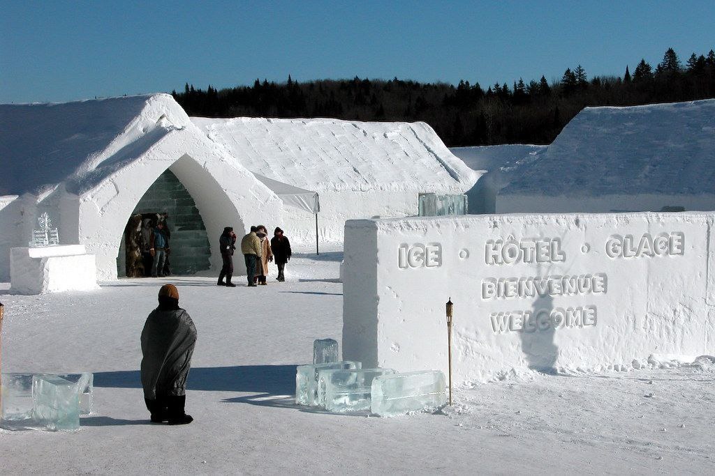 Канада 🇨🇦, Квебек, Hotel de Glace🧊 Ледяная гостиница является достопримечательностью Канады и считается одним из лучших пятизвёздочных отелей в мире, построенных только изо льда. Мебель, очень удобная, по оценкам туристов, также сделана изо льда. Здесь есть свой бар, кинотеатр, две художественные галереи и, конечно же, комфортабельные номера со всеми удобствами, а также туалет с подогревом и джакузи на открытом воздухе. Только спать приходится в спальных мешках на меху. Впервые отель открыл свои двери в январе 2001 года, а находится он недалеко от Квебека, рядом с водопадом Монморанси. Ежегодно его посещают более 500 тыс. туристов. Площадь комплекса небольшая — всего 3 тыс.кв.м., и каждый год на ней отстраиваются домики с новыми интерьерами. На сооружение этого оригинального отеля уходит около 4,5 тыс. тонн снега и 250 тонн льда. Понятно, что техника в нём настоящая, а не ледяная, да и двери — из дерева, и камин горит обжигающим пламенем, но в баре есть стаканы из стойкого льда.
