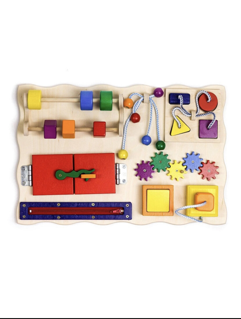 Нашему малышу 10 месяцев, он активно познаёт мир, а мы как родители в этом помогает. Все знают, как важно развивать у ребёнка мелкую моторику рук, которая связана на прямую с развитием речи ребёнка. Так вот с недавних пор для развития моторики стала популярна такая штука, как бизиборд. Простыми словами-это доска с предметами быта, игрушками на развитие мелкой моторики, ещё развивает навыки самообслуживания. Так вот, так как я нахожусь в декрете, работает один муж, посмотрев цены на бизиборды, мы поняли, что сейчас у нас нет лишних денег его покупку. Поэтому муж решил сделать его сам. На все про все у него ушло около 30 минут. За основу мы взяли столешницу от старого стола, чтобы не вешать ей на стену, муж распилил ее на 2 равные половники и соединил навесами. Далее мы нашли дома: ленту от подарка, на неё повешали кольца от гардины, гремит шумит ( ребёнок в восторге, это хорошо), пришцрупили, готово; самая любимая штуковина, это спинер, дома есть у каждого, если нет цена около 100 рубле