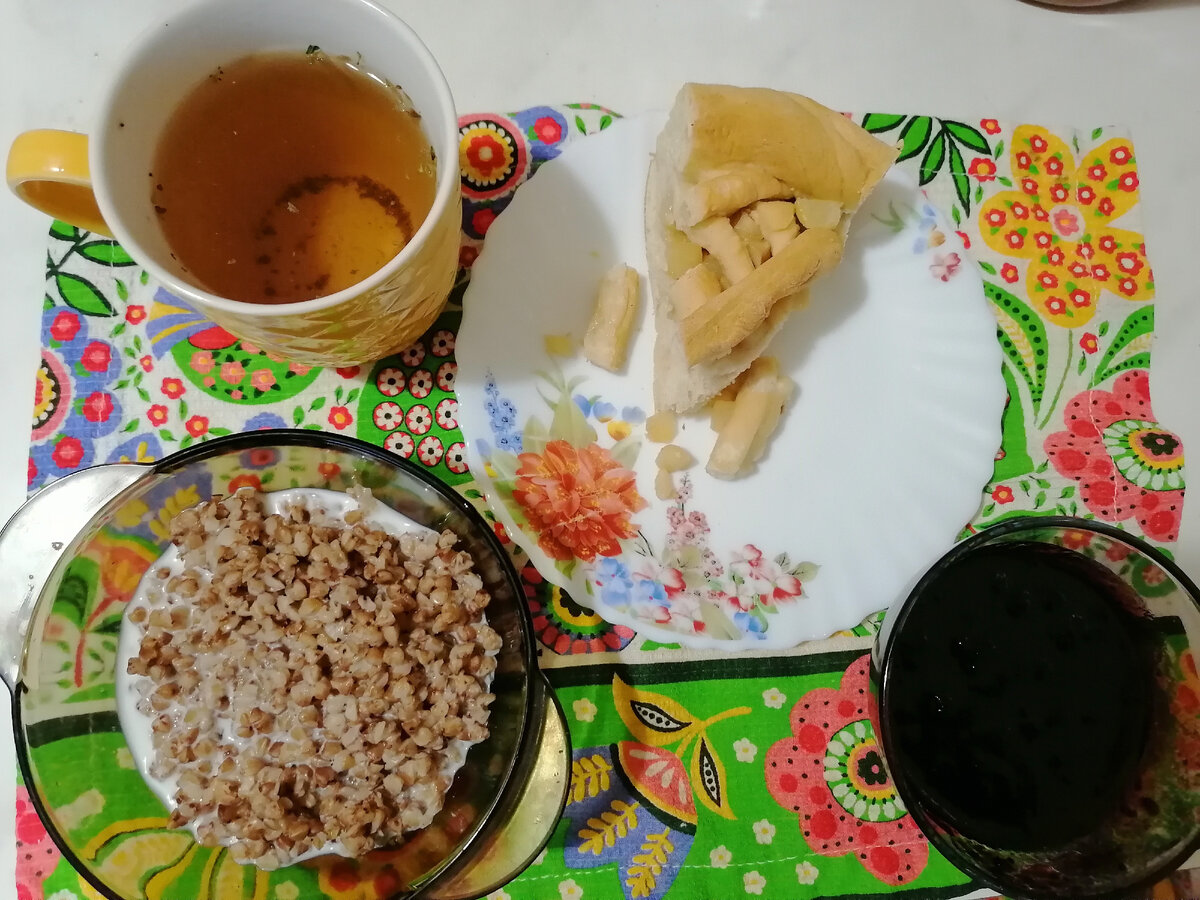Сегодня встала и решила узнать, как у меня обстоят дела с весом. Встала на весы - там 69,8 кг. Так что все нормально, не худею и не полнею (на начало эксперимента мой вес был 70 кг ровно). Хотя... пару кг была бы не прочь скинуть. Мне 49 лет, я живу вдвоем с сыном-подростком, и на питание у меня уходит менее 10000 рублей в месяц. Конечно, не всегда оно бывает полноценным, поэтому я решила в течение месяца питаться не только дешево, но и правильно, и результатами эксперимента делиться с читателями. Завтрак Утром я сварила гречку в мультиварке. На завтрак решила просто залить её молоком - получилось вкусно, даже масло не добавляла. В качестве чая сегодня была душица - ароматная успокаивающая травка, к чаю - яблочный пирог и ложка варенья. Обед На обед брала гречку с котлетой, помидоры, хлеб домашний, травяной чай, к чаю - три кусочка шоколадки. Насчет котлет, которые уже, наверно, надоели читателям... Конечно, лучше бы было приготовить разнообразные полуфабрикаты, но котлеты - моё люби