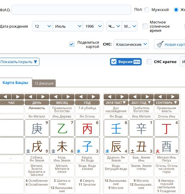 Коуча по отношениям Сашу Мур (настоящее имя Александра Мурсалова) нашли мертвой возле дома, где она проживала, в Санкт-Петербурге. 25-летнюю Сашу в припадке ревности зарезал муж Рустам Мурсалов. Он нанес супруге около десяти ударов кухонным ножом, а потом выкинул тело девушки в окно с 13-го этажа. Дата рождения погибшей девушки Саши Мур - 12 июля 1996. Посмотрим быстренько, что же там. А там все очень видно, даже на первый взгляд. С 2018 года для нее пришел новый такт удачи - Вода Ян на Драконе, Дух наслаждения для нее пришел, а Дух наслаждения в сфере Воды - это секс в квадрате. Вот она и стала секс-коучем. Дракон сталкивается с Собакой в доме брака - активизация партнерства во всяких вариантах на десять лет обеспечена. Но более всего Дракон сливается с Крысой года - и такую большую воду образует. Секс, вода, самовыражение - в этой сфере и поперло. А с точки зрения гармонии элементов - элемент Власти-мужа (Огонь Ян в годовом столпе) в начал тонуть в нахлынувшей Воде, мужу начало каз