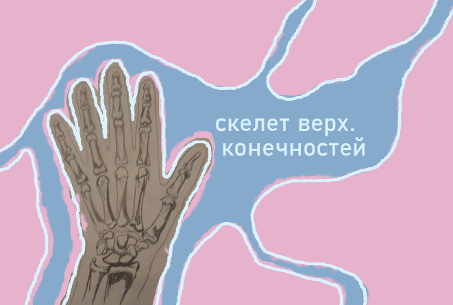 плеч. кость - длин. трубчатая кость, в сечении - треугольник; бугор - апофиз верх. эпифез - круглая головка, Б бугор, межбугорковая бороздка, М бугор; нижн. эпифиз расширен и уплощен, образует мыщелок плечевой кости; предплечье: 2 || кости - лучевая, локтевая; кисть развернута ладонью наружу - кости идут || - супинация; ладонь вниз → перекрещиваются - пронация. сложный по строению локтевой сустав: скелет кисти: кости запястья, фаланги пальцев. кости запястья: 7 костей неправ. формы, покрыты скользкой хрящевой тканью, плотно прилегают друг к другу; свод ладони: трубчатые кости; 4 объед. связками и сухожилиями, пястная кость Б пальца - отдельно. фаланги: ← соед. блоковидными суставами: обеспечивают сгибание-разгибание.