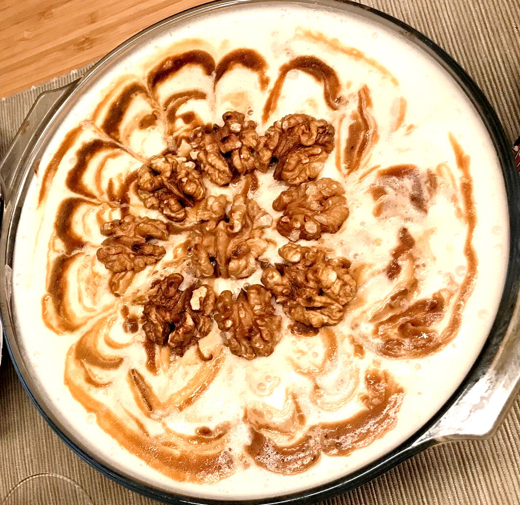 Массу вылить в форму для застывания и постепенно вливать кофе с желатином, ложкой или палочкой кофейную массу провести в виде рисунка (у меня получилось не идеально)