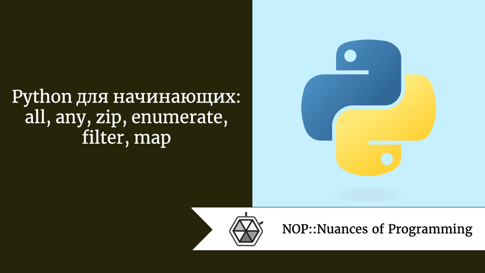 Функция all() в Python принимает в качестве параметра любой итерабельный объект: список, кортеж, множество словарь или диапазон. Данная функция возвращает True, если все элементы итерируемого объекта равняются True, а в противном случае — False. Любой числовой тип данных, кроме нуля, равняется True, а любая строка, содержащая более одного символа, также равняется True. Ознакомьтесь с несколькими примерами применения функции all():