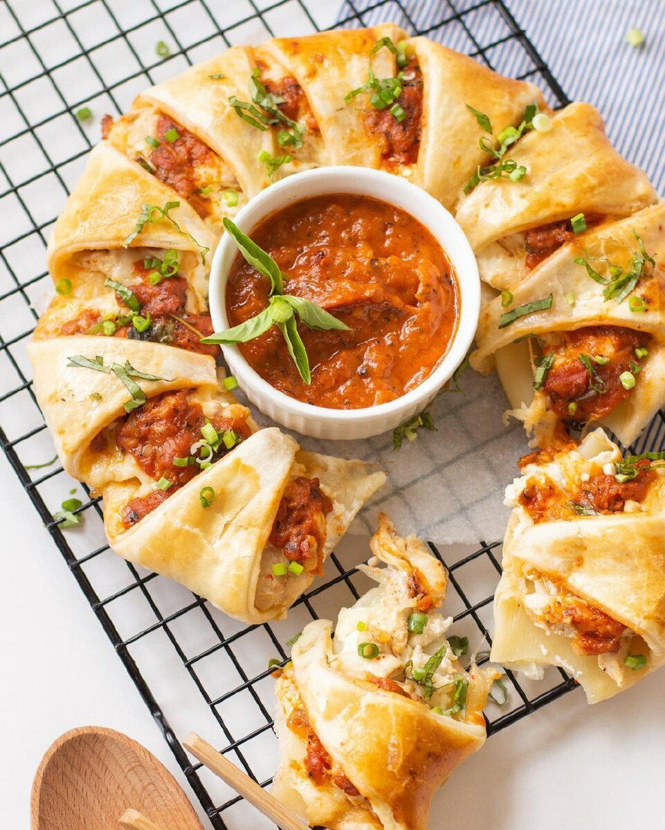 Ингредиенты: Слоеное бездрожжевое - 1 уп. Куриная грудка - 1 шт. Творожный сыр - 60 гр. Сыр моцарелла - 100 гр. Базилик - 3-4 листочка Соль, черный перец и паприка по вкусу Томатный соус Приготовление: Куриную грудку нарезаем кубиками средних размеров и обжариваем со специями, сыр натираем на тёрке.Тесто размораживаем, раскатываем в пласт и вырезаем 10 треугольничков.Выкладываем наши треугольнички внахлест по форме круга, как это показано на фото.На основу из теста поочередно выкладываем сыр, курицу, еще раз сыр и томатный соус. Вершинами треугольников накрываем начинку внутрь бублика.Смазываем слоеную пиццу яйцом и выпекаем в духовке 25-30 минут при температуре 180 С. Подавайте закуску с вашим любимым соусом - кетчупом, чили или сальсой. Приятного аппетита❤️