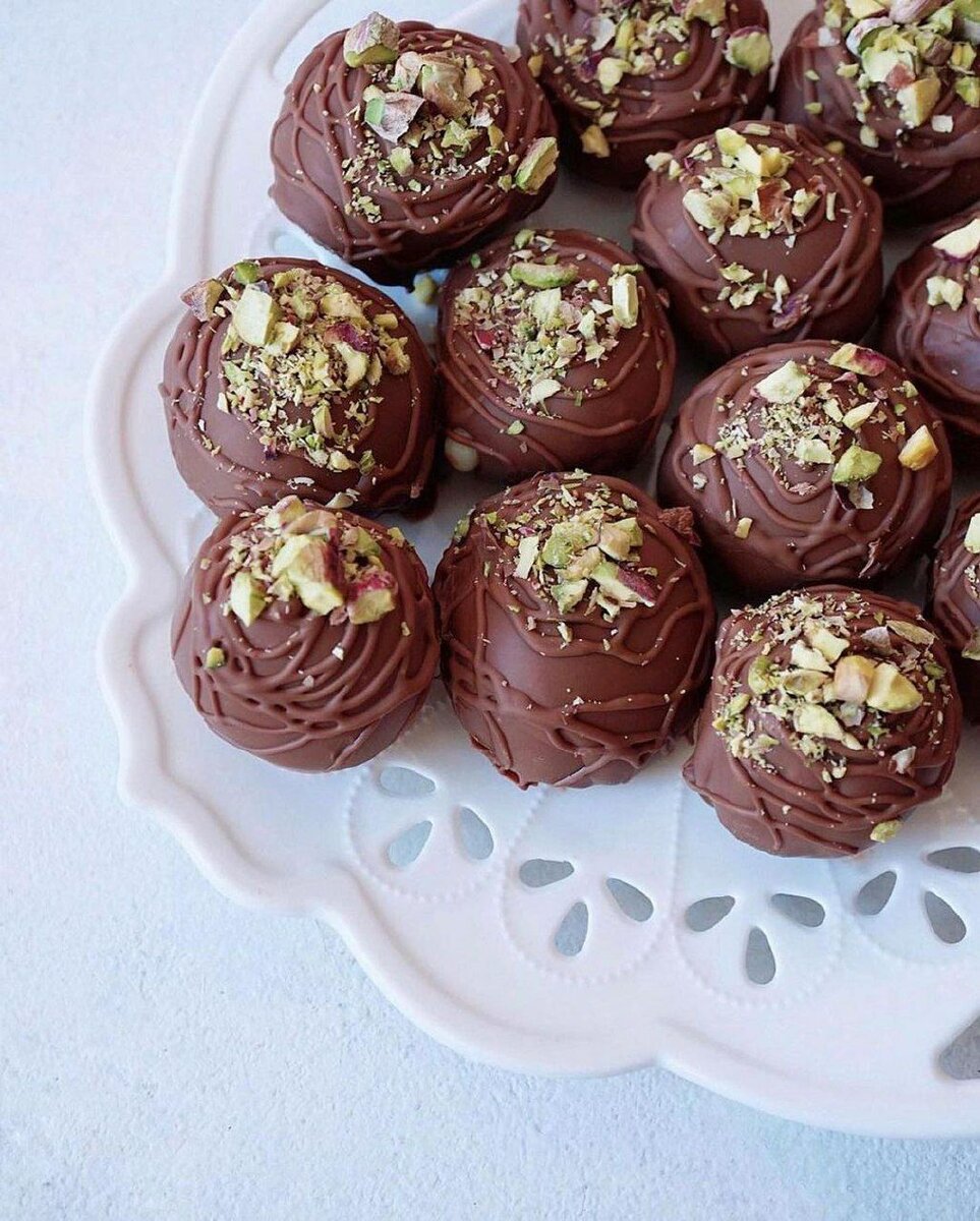 Ингредиенты: Сливки 33-35% 100 г Белый шоколад 200 г Сливочное масло 40 г Миндальная мука 50 г (если нет ее, можно измельчить!фисташки в кофемолке и заменить на фисташковую муку) Для глазирования: Шоколад 200 г Приготовление: Сливки подогреть, не доводя до кипения. Вылить на шоколад, перемешать до однородности.Сливочное масло нарезать на кусочки и ввести в тёплую массу, перемешать.Фисташки нарубить ножом, добавить в массу вместе с миндальной мукой. Тщательно перемешать. Закрыть пленкой «в контакт» и убрать в холодильник на 8-10 часов.Достать из холодильника. Ложкой отделять массу, влажными руками скатать шарики (20-25 грамм).Убрать в холодильник на час или в морозилку на 15 минут. Шоколад темперировать или использовать глазурь Гурме, когда на 200 г растопленного шоколада добавляется 15 грамм растительного масла.Глазировать конфеты. Хранить в холодильнике. Приятного аппетита❤️