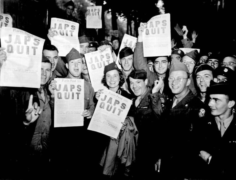 American servicemen in the Rainbow Corner Red Cross Club in Paris are happy to win over Japan, posing with the Paris Post newspapers, with the headlines “JAPS QUIT”.