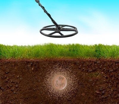 Монета выкопана, но при поиске в вынутой земле встала на ребро. При дальнейших поисках перекатывается в налипшем комке земли с ребра на ребро, не поворачиваясь плоскостью к кольцу.