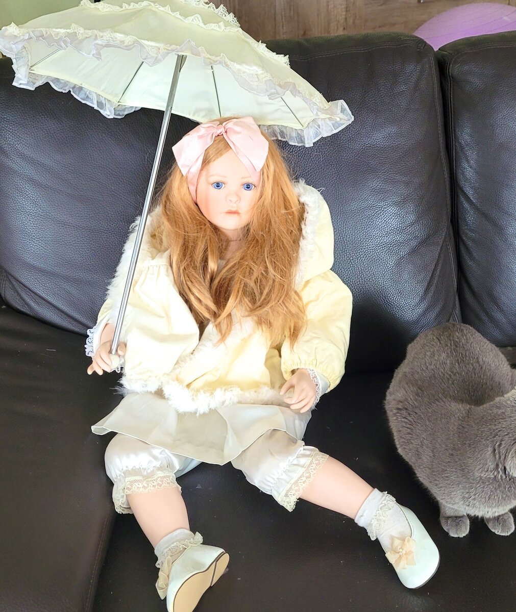 Нашла редкую куклу от Ute Kase Lepp , фотографирую для моих подписчиков в инсаграмме Эта кукла была создана прекрасным мастером Ute Kase Lepp в 2000 году, и судя по состоянию своей одежды провела несколько лет своей жизни на чердаке. Я отстирала зонтик и почистила одежду. Меховая пелеринка линяет. Кукла очень реалистичная и похожа на маленькую девочку. Мой котик увидев ее кинулся сразу к ней и не хотел от нее отходить, так я его и сфоткала вместе с ней)) Наверно это любофф!!!!!!!))))) Куколка 70 см. А во всем мире есть только 500 таких куколок, если малютка понравилась то ставьте лайк))