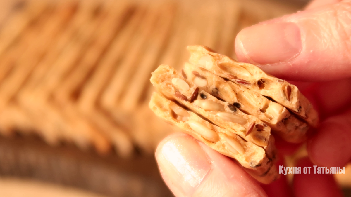 Всем привет! Сегодня, я приготовила хрустящие хлебцы из ржаной муки. Готовятся хлебцы быстро и просто. Их можно использовать как перекус, а также удобно брать с собой на работу или учебу. СПОСОБ ПРИГОТОВЛЕНИЯ: Для приготовления, смешиваю различные семечки и семена. У меня кунжут, семя льна и семечки подсолнуха. В тарелку для смешивания, высыпаю ржаную муку, добавляю разрыхлитель и половину чайной ложки соли. Высыпаю подготовленную смесь из семечек и семян. Все ингредиенты перемешиваю венчиком, чтобы они распределились равномерно. В смесь можно также добавить отруби или другие семена или орешки. Выливаю растительное масло без запаха и добавляю воду. Перемешиваю ингредиенты ложкой, затем замешиваю тесто руками. Тесто получается мягкое, податливое и послушное. Раскатываю тесто на бумаге для выпечки. Ее размер такой же, как у противня, на котором буду готовить. Очень важно, чтобы пергамент был с силиконовым покрытием, тогда хлебцы к нему не прилипнут и будут легко отделяться. Придаю тес