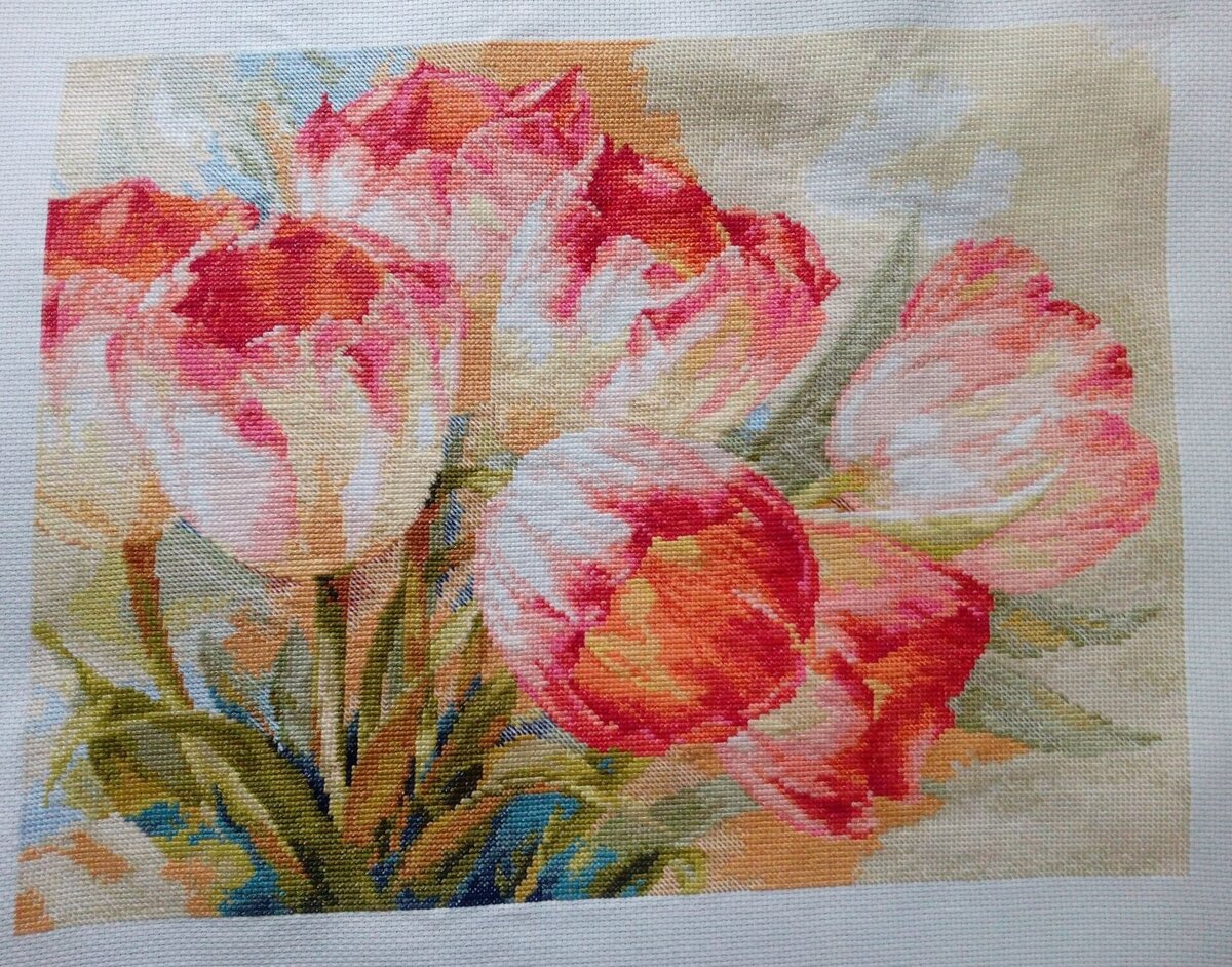 Всем большой вышивальный привет! Когда-то у меня были намерения каждый месяц публиковать на канале свои вышивальные итоги и показывать, что я что-то вышиваю, а не просто так за новинками слежу и статьи на рукодельные темы пишу. Намерения так и остались намерениями. То есть более интересные темы, то вышивку никак не удается хорошо сфотографировать, то вышивается мало. Особенно медленно у меня вышиваются большие процессы, а большим я считаю все, что превышает 30 см. хотя бы по одной стороне. Но вот по прошествии нескольких месяцев с момента последнего вышивального отчета мне опять есть что показать. Не скажу, что лето было плодотворным, огород и заготовки занимают львиную долю свободного времени, но кое-что я все-таки смогла вышить. Самая большая работа, которую я вышила летом - это набор "Алиса" арт. № 2-29 "Тюльпаны". Размер работы - 40х30, канва Аида 14-го каунта, мулине Gamma 35 цветов. Из-за того, что фон вышивается полукрестом, работу немножко перекосило. Не знаю как у вас, а у м
