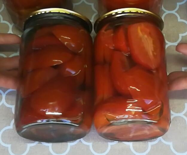 Чтобы продлить удовольствие зимой вкусом свежих помидоров, лучше консервировать их в банки объемом 0,7 л, но можно использовать и банки по 0,5 или 1 л. Консервировать - громко сказано. Ведь нам не понадобится ни соль, ни сахар, ни даже уксусная кислота или столовый уксус. Зимой такие помидоры получаются как свежие. Из них можно готовить салат, добавлять в кулинарные блюда, к гарниру, готовить пиццу... Расчет таков: на 3 банки по 0,7 мл понадобится 1,5 кг твердых спелых помидоров, лучше всего для этого подходит сорт "Пикули", их еще называют сливками. А почему сейчас можно их закрывать в банки? Да потому, что осенью они меньше поливаются, сока в них тоже становится меньше. Мы с мужем купили большую коробку пикулей, почти 3 недели их едим свежими, но становится прохладнее и, чтобы они не испортились, я решила их переработать. Ниже в видео я показываю этот рецепт: Помидоры хорошо помыть, разрезать пополам, удалить плодоножку, плотно уложить в банки, залить водой комнатной температуры.