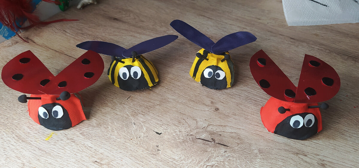 Всем привет) Энциклопедию почитали и решили с детьми смастерить любимых Юлиных насекомых - божью коровку и пчелку. Недавно где-то интернете видела подборку поделок из яичных лотков и вот решила тоже поэкспериментировать. Нам понадобятся - яичный лоток (если Вы опасаетесь сальмонеллеза, то достаточно прогреть лоток в разогретой выше 150 градусов духовке пару секунд, так как бактерии погибают уже при 70 градусах за 60 сек.), краски, цветной картон, клей, зубочистки и пластилин. Для начала вырезаем ячейки из лотка И красим их в нужные цвета - у нас желтый, красный и черный. Из цветного картона вырезаем крылышки. Приклеиваем к нашей основе Так же вырезаем и приклеиваем глазки Усики делаем из зубочисток - красим их в черный цвет, делим пополам и на кончики сажаем по маленькому шарику черного пластилина. Наши поделки готовы! Отличного Всем настроения и до новых встреч! #детские_поделки #своими_руками #творчество #развитие #дети