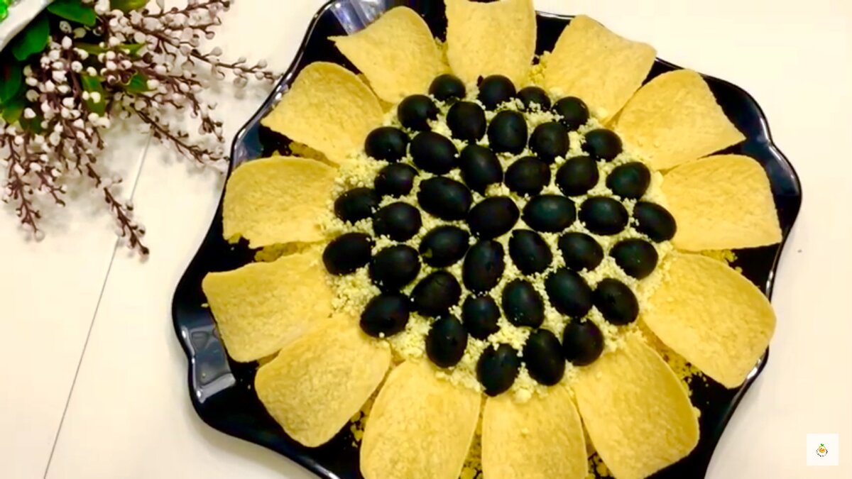 Салат с курицей и чипсами. Здравствуйте дорогие друзья 💗 Сегодня поделюсь с вами рецептом салата "ПОДСОЛНУХ" 🌻 Меня он привлекает в первую очередь своим внешним видом. Яркие краски этого блюда на праздничном столе, радуют глаз🌻 Сделать такой салат не составит труда. РЕЦЕПТ : Приготовление: 1 слой - куриная грудка 2 слой - обжар. шампиньоны с луком 3 слой - натертые белки на крупной тёрке 4 слой - консервированная кукуруза 5 слой - натертый желток на мелкой терке Украшаем как показано в видео. Приятного аппетита!!! #салаты рецепты #салат с курицей #салат с чипсами #салат на праздничный стол