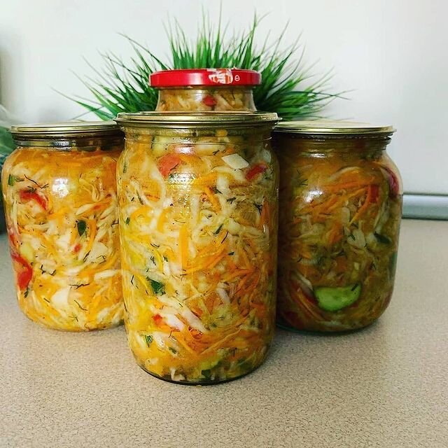 Очень вкусно получается, обожаю капусту😋 ⠀ Ингредиенты: ⠀ Приготовление: Нашинковываем капусту и солим перемешиваем и слегка придавливаем! Затем нарезаем лук и снова перемешиваем, затем укроп! Морковку натираем на тёрке( как корейская морковь) и снова перемешиваем и слегка придавливаем ! Добавляем сахар и чеснок с острым перцем нарезаем соломкой и снова перемешиваем! Наша капуста должна дать сок, дорезаем огурцы и помидоры перчим заливаем маслом! Ставим на огонь на минут 10 и добавляем 150 мл 9% уксуса , тщательно перемешиваем ! Всё укладываем по банкам стерилизованным и закрываем крышкой и под одеяло на ночь! Приятного аппетита! И благодарю за лайки ❤️ #заготовки на зиму