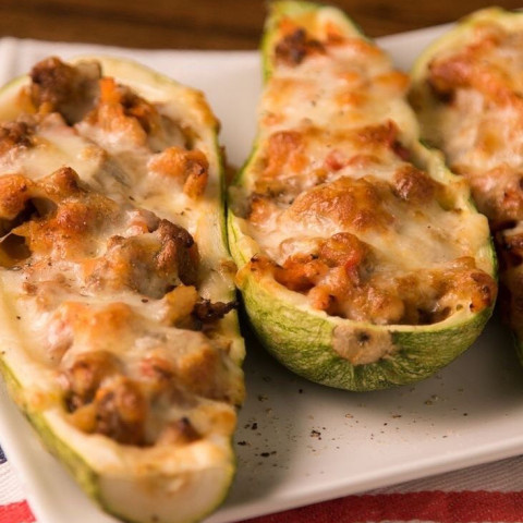 Кабачки выньте из духовки, наполните лодочки подготовленной кур