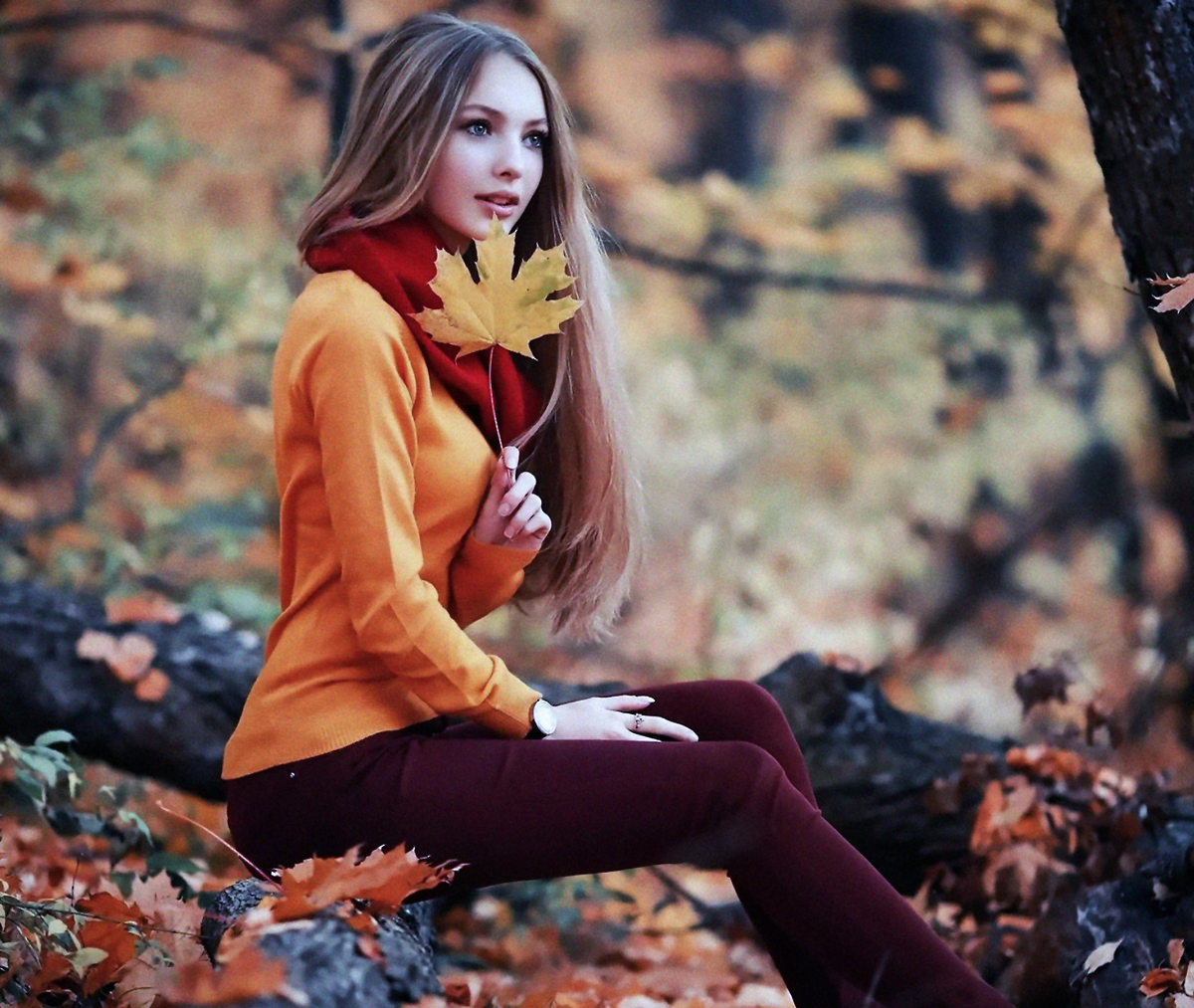 Опадают листья в лесу и девушка сидит